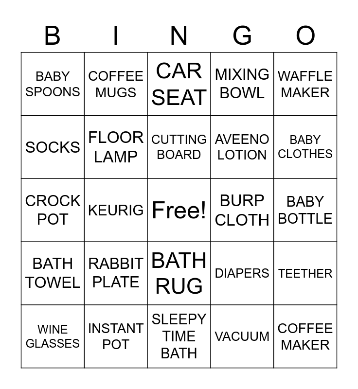 This bingo card has a free space and 41 words: WALL CLOCK, CROCK POT, HAND MIXER, FLOOR LAMP, INSTANT POT, BATH RUG, CUTTING BOARD, KITCHEN TOWELS, WAFFLE MAKER, BATH TOWEL, KEURIG, MIXING BOWL, COFFEE MAKER, BABY BOTTLE, BURP CLOTH, RABBIT PLATE, PURPLE BOWL, BABY SPOONS, STROLLER, CAR SEAT, TEETHER, BABY DOME, SLEEPY TIME BATH, AVEENO LOTION, BABY MONITOR, BABY BLANKET, VACUUM, KNIVES, BABY CLOTHES, CANISTER, POTS & PANS, COFFEE MUGS, WINE GLASSES, PANINI MAKER, DIAPERS, SOCKS, WIPES, BIB, PLUSH TOY, RATTLE and BABY FOOD.