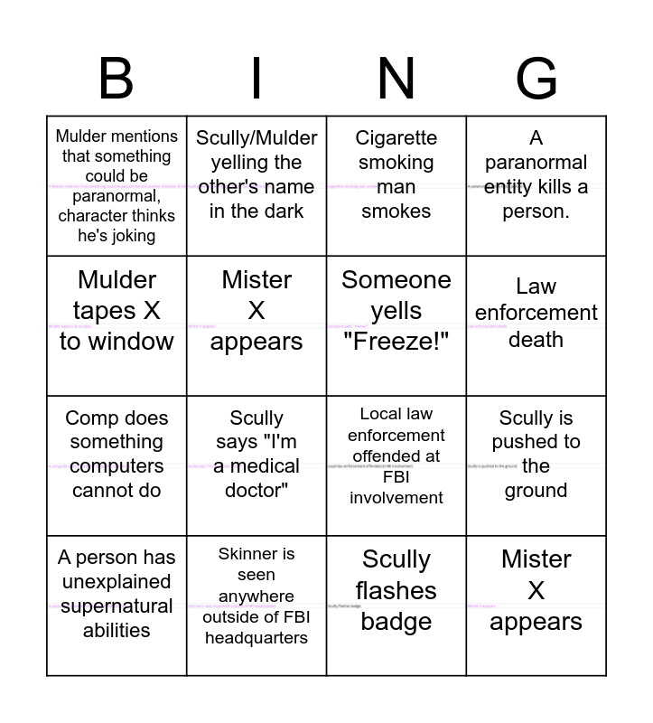 This bingo card has 17 images and 17 words: Scully flashes badge, A person has unexplained supernatural abilities, Cigarette smoking man smokes, Mulder mentions that something could be paranormal, character thinks he's joking, Scully says "I'm a medical doctor", A paranormal entity kills a person., Scully is pushed to the ground, Someone yells "Freeze!", Law enforcement death, Mister X appears, Skinner is seen anywhere outside of FBI headquarters, Local law enforcement offended at FBI involvement, Mulder tapes X to window, Scully/Mulder yelling the other's name in the dark, Comp does something computers cannot do, Flashlight gets dropped or stops working and Mister X appears.