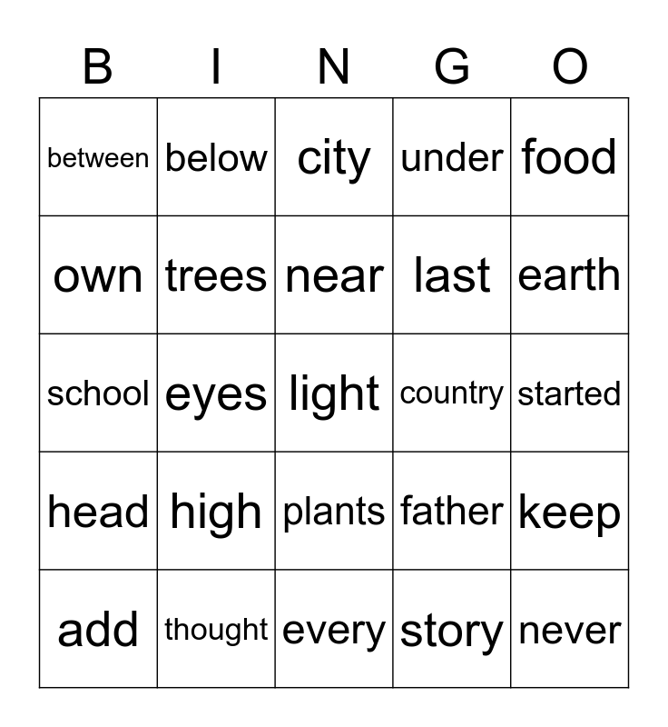 This bingo card has 25 words: high, every, near, add, food, between, own, below, country, plants, last, school, father, keep, trees, never, started, city, earth, eyes, light, thought, head, under and story.