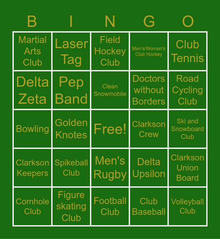 This bingo card has a free space and 45 words: Competitive Bass Fishing, Volleyball Club, Mountain Bike Club, Cornhole Club, Club Soccer, Club Baseball, Field Hockey Club, Paintball Club, Club Tennis, Figure skating Club, Men's/Women's Club Hockey, Clarkson Crew, Men's Rugby, Spikeball Club, Clarkson High Dive (ultimate frisbee), Football Club, Badminton Club, Bowling, Equestrian, Road Cycling Club, Laser Tag, Barbell Club, Club Lacrose, Martial Arts Club, Esports Club, Ski and Snowboard Club, Women's Rugby, Goldies Dance Team, Delta Upsilon, Clarkson Keepers, Foodies Club, Clarkson Union Board, ChemE Car, Chess Club, Outing Club, Golden Knotes, Rod and Gun Club, EMS, Garden Club, Clean Snowmobile, Delta Zeta, Doctors without Borders, Clarkson Integretor, Pep Band and Value U.
