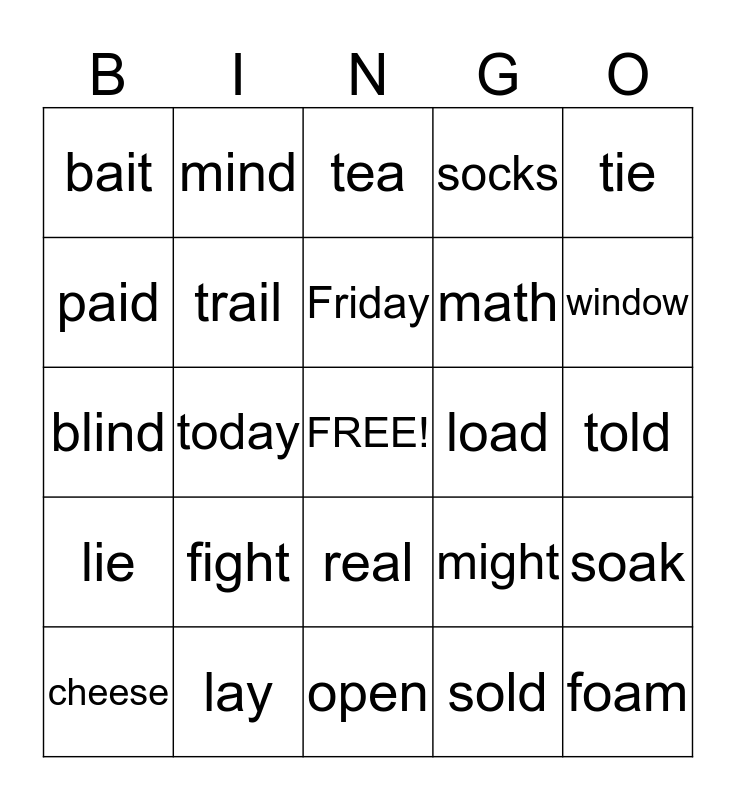 This bingo card has a free space and 30 words: lay, seem, today, speed, bait, tea, trail, real, load, open, told, foam, sold, yellow, window, pie, might, lie, fight, tie, blind, mild, mind, math, paid, socks, soak, cheese, Friday and sticky.