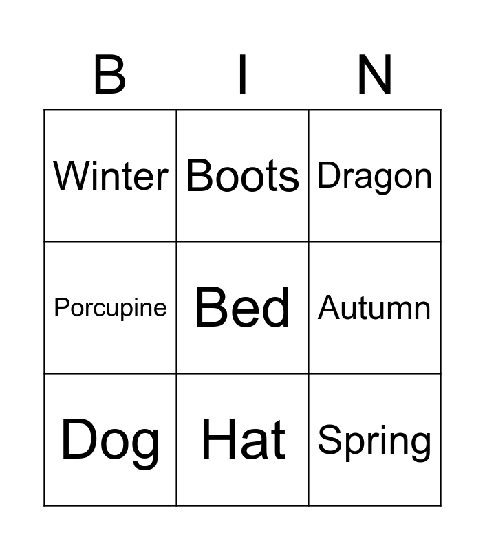 This bingo card has 46 words: Free!, Red, Blue, Fireman, Green, Coat, Boots, Summer, Autumn, Pet, Dog, Porcupine, Hippo, Mom, Dad, Sunglasses, Hat, Garden, Giraffe, Bed, Car, Truck, Winter, Spring, Cold, Hot, Scarf, Snow, Pig, Bath, Star, Eat, Sing, Jump, Listen, Quiet, Purple, Orange, Beach, Phone, Watch, Dragon, Panda, Cow, Sheep and Barn.