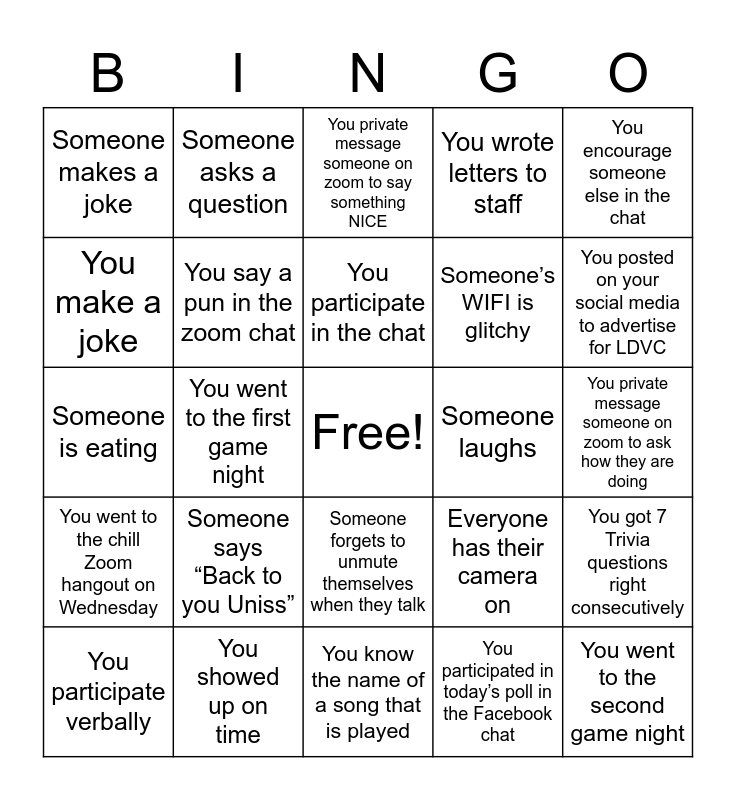 This bingo card has a free space and 24 words: Someone says “Back to you Uniss”, You showed up on time, You participate in the chat, You participate verbally, You encourage someone else in the chat, Someone makes a joke, You make a joke, Someone asks a question, Someone laughs, Someone forgets to unmute themselves when they talk, Someone’s WIFI is glitchy, Someone is eating, Everyone has their camera on, You got 7 Trivia questions right consecutively, You say a pun in the zoom chat, You participated in today’s poll in the Facebook chat, You private message someone on zoom to ask how they are doing, You private message someone on zoom to say something NICE, You posted on your social media to advertise for LDVC, You went to the first game night, You went to the second game night, You went to the chill Zoom hangout on Wednesday, You wrote letters to staff and You know the name of a song that is played.