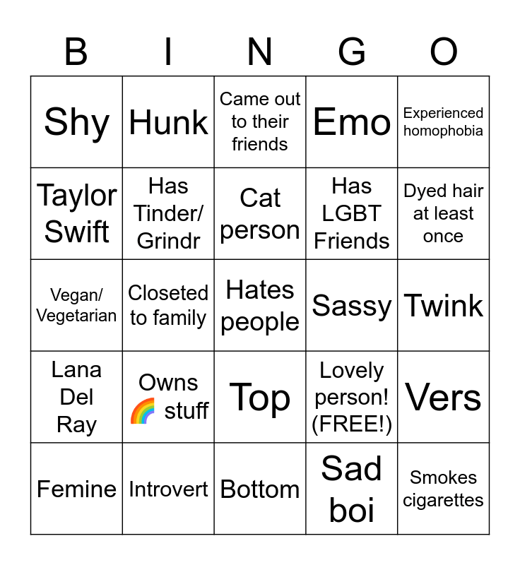 This bingo card has 25 words: Owns 🌈 stuff, Bottom, Cat person, Femine, Experienced homophobia, Shy, Taylor Swift, Hunk, Sassy, Top, Has LGBT Friends, Vegan/ Vegetarian, Lovely person! (FREE!), Vers, Has Tinder/ Grindr, Smokes cigarettes, Twink, Came out to their friends, Dyed hair at least once, Closeted to family, Hates people, Introvert, Lana Del Ray, Emo and Sad boi.
