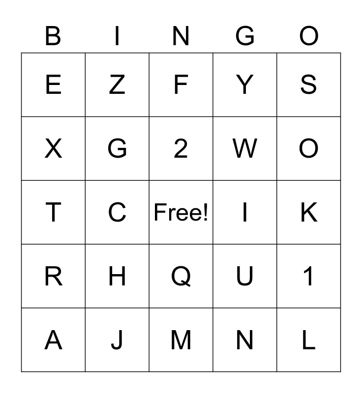 This bingo card has a free space and 29 words: A, B, C, D, E, F, G, H, I, J, K, L, M, N, O, P, Q, R, S, T, U, V, W, X, Y, Z, 1, 2 and 3.