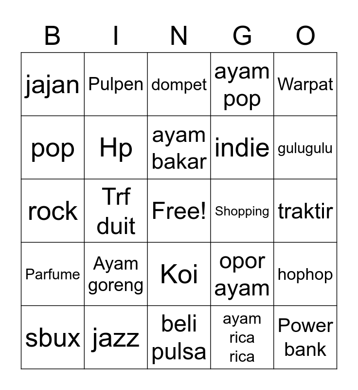 This bingo card has a free space and 24 words: Ayam goreng, jazz, ayam bakar, sbux, Warpat, jajan, pop, Pulpen, Shopping, Koi, indie, rock, opor ayam, hophop, Hp, ayam rica rica, traktir, dompet, gulugulu, Trf duit, Power bank, Parfume, ayam pop and beli pulsa.