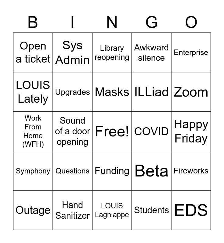 This bingo card has a free space and 39 words: Can you see my screen?, Can you hear me?, You’re muted, Upgrades, Outage, Funding, Masks, A cat sighting, Enterprise, Symphony, Sound of a door opening, Awkward silence, EDS, Happy Friday, COVID, Questions, Computer notification sounds, Open a ticket, SirsiDynix, Beta, LOUIS Lately, LOUIS Lagniappe, ILLiad, Zoom, Holdings Management, 6 feet apart, Social distancing, Fall Semester, TASK Ticket, Sys Admin, A virtual background, Remote work, Library reopening, Hand Sanitizer, Students, Faculty, Fireworks, Work From Home (WFH) and Someone Wearing A Hat.