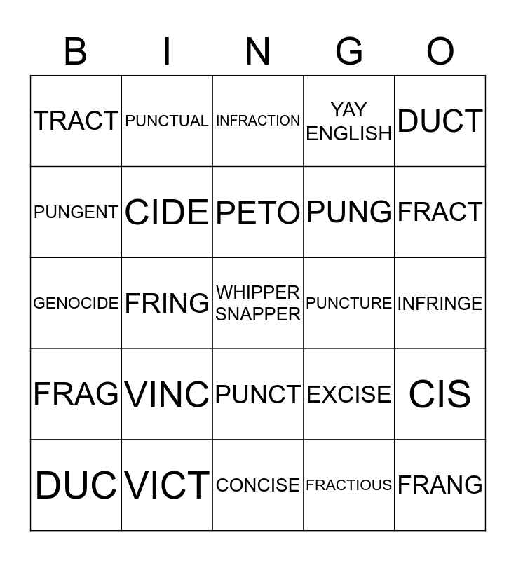 This bingo card has a free space and 24 words: VINC, VICT, PETO, DUC, DUCT, TRACT, PUNGENT, PUNCTUAL, PUNCTURE, PUNCT, PUNG, GENOCIDE, EXCISE, CIS, CIDE, FRACTIOUS, INFRINGE, INFRACTION, FRACT, FRING, FRANG, FRAG, YAY ENGLISH and CONCISE.