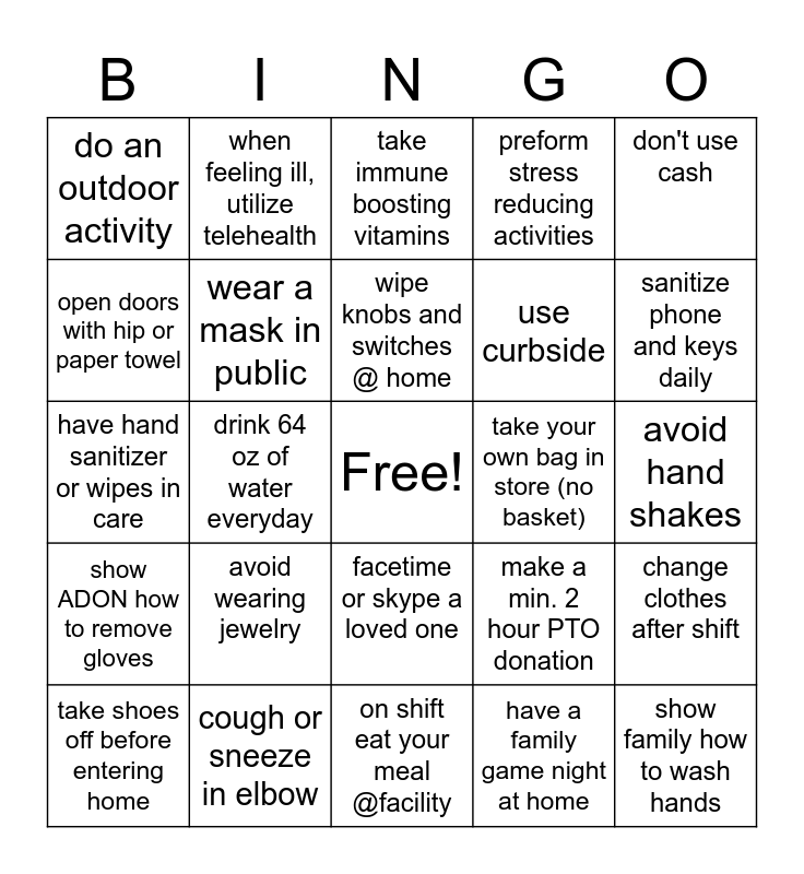 This bingo card has a free space and 24 words: avoid wearing jewelry, cough or sneeze in elbow, wipe knobs and switches @ home, take shoes off before entering home, don't use cash, do an outdoor activity, open doors with hip or paper towel, when feeling ill, utilize telehealth, take your own bag in store (no basket), facetime or skype a loved one, use curbside, have hand sanitizer or wipes in care, make a min. 2 hour PTO donation, change clothes after shift, wear a mask in public, have a family game night at home, avoid hand shakes, take immune boosting vitamins, sanitize phone and keys daily, drink 64 oz of water everyday, show family how to wash hands, show ADON how to remove gloves, preform stress reducing activities and on shift eat your meal @facility.