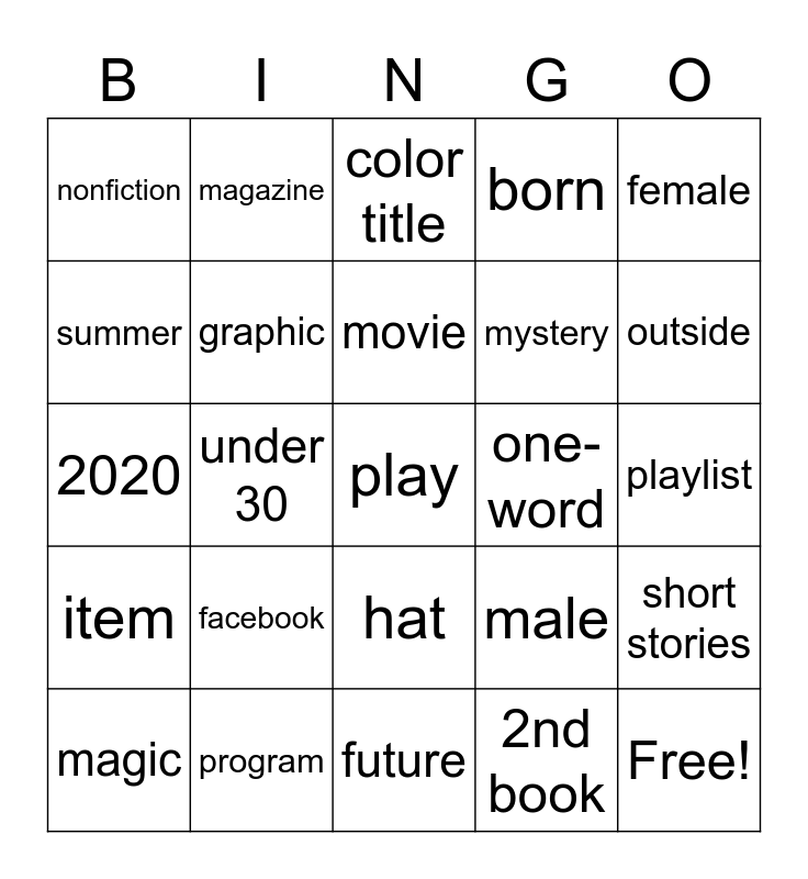 This bingo card has 34 words: Free!, 2nd book, 10 years old, best friend, item, graphic, female, magic, magazine, without love, movie, color title, create, review, one-word, outside, program, 2020, facebook, male, hat, lgbtq, nonfiction, playlist, future, play, born, challenged, mystery, summer, person of color, under 30, short stories and another country.