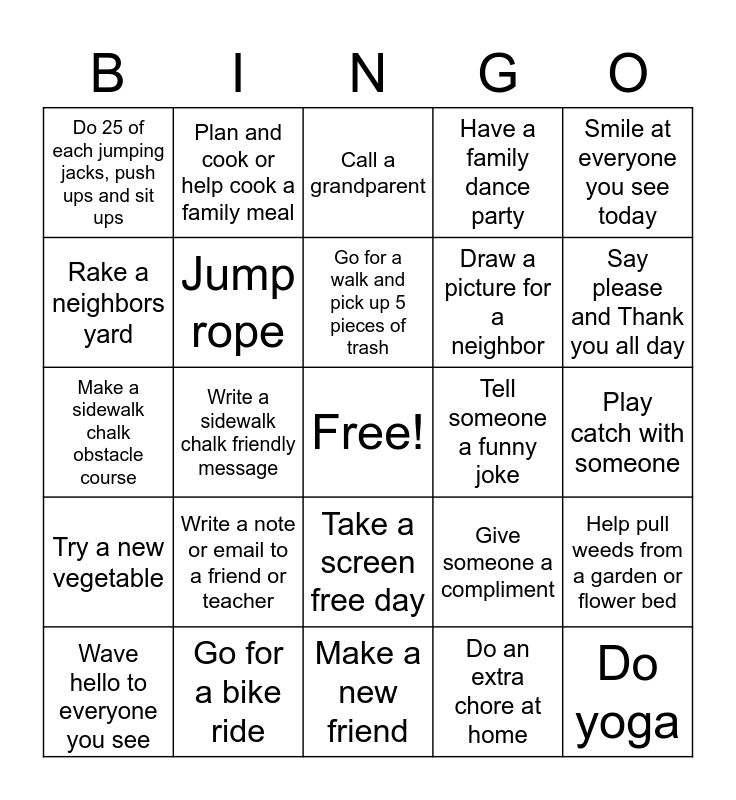This bingo card has a free space and 24 words: Wave hello to everyone you see, Write a note or email to a friend or teacher, Go for a walk and pick up 5 pieces of trash, Do an extra chore at home, Smile at everyone you see today, Do 25 of each jumping jacks, push ups and sit ups, Plan and cook or help cook a family meal, Call a grandparent, Tell someone a funny joke, Play catch with someone, Make a sidewalk chalk obstacle course, Jump rope, Give someone a compliment, Help pull weeds from a garden or flower bed, Rake a neighbors yard, Go for a bike ride, Make a new friend, Have a family dance party, Say please and Thank you all day, Try a new vegetable, Write a sidewalk chalk friendly message, Take a screen free day, Draw a picture for a neighbor and Do yoga.