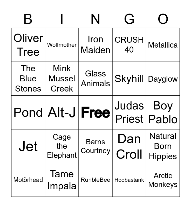 This bingo card has a free space and 24 words: Cage the Elephant, Tame Impala, Glass Animals, Motörhead, Metallica, Oliver Tree, The Blue Stones, Wolfmother, Judas Priest, Barns Courtney, Skyhill, Pond, Dan Croll, Natural Born Hippies, Mink Mussel Creek, Hoobastank, Boy Pablo, Iron Maiden, Dayglow, Alt-J, Arctic Monkeys, Jet, CRUSH 40 and RunbleBee.