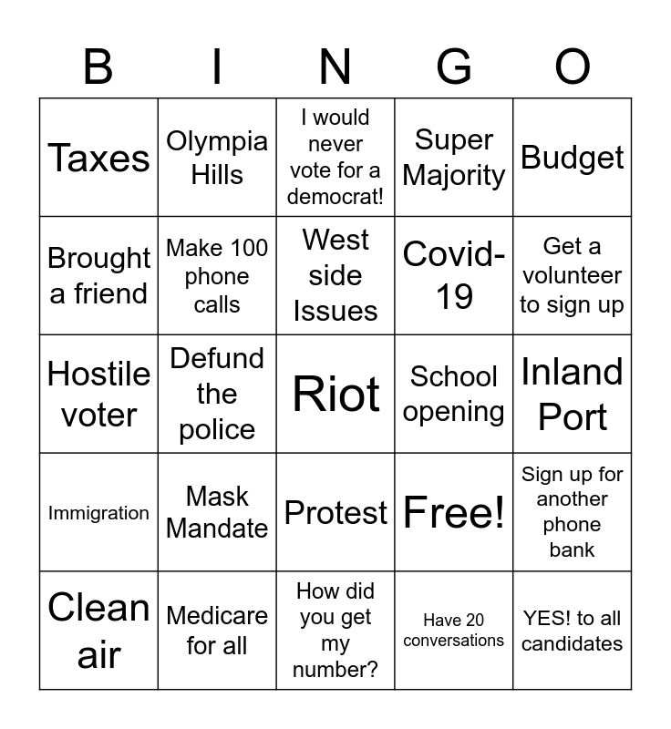 This bingo card has 25 words: Mask Mandate, How did you get my number?, West side Issues, Clean air, Budget, Taxes, Brought a friend, Olympia Hills, School opening, Protest, Covid-19, Hostile voter, Free!, Sign up for another phone bank, Make 100 phone calls, YES! to all candidates, Inland Port, I would never vote for a democrat!, Get a volunteer to sign up, Defund the police, Riot, Medicare for all, Immigration, Super Majority and Have 20 conversations.