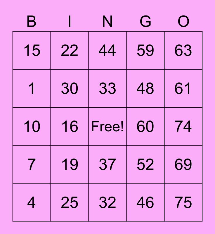 This bingo card has a free space and 24 words: 4, 19, 33, 46, 63, 15, 22, 44, 60, 74, 10, 30, 52, 69, 1, 25, 32, 59, 61, 7, 16, 37, 48 and 75.