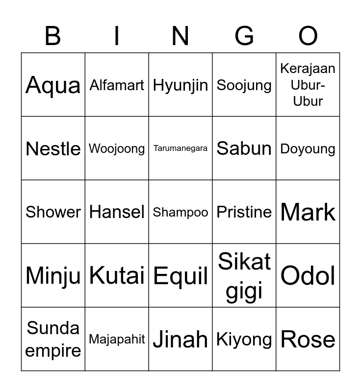 This bingo card has a free space and 24 words: Kutai, Majapahit, Tarumanegara, Sunda empire, Kerajaan Ubur-Ubur, Aqua, Nestle, Alfamart, Pristine, Equil, Sabun, Shower, Sikat gigi, Odol, Woojoong, Kiyong, Mark, Hyunjin, Doyoung, Hansel, Rose, Minju, Soojung and Jinah.