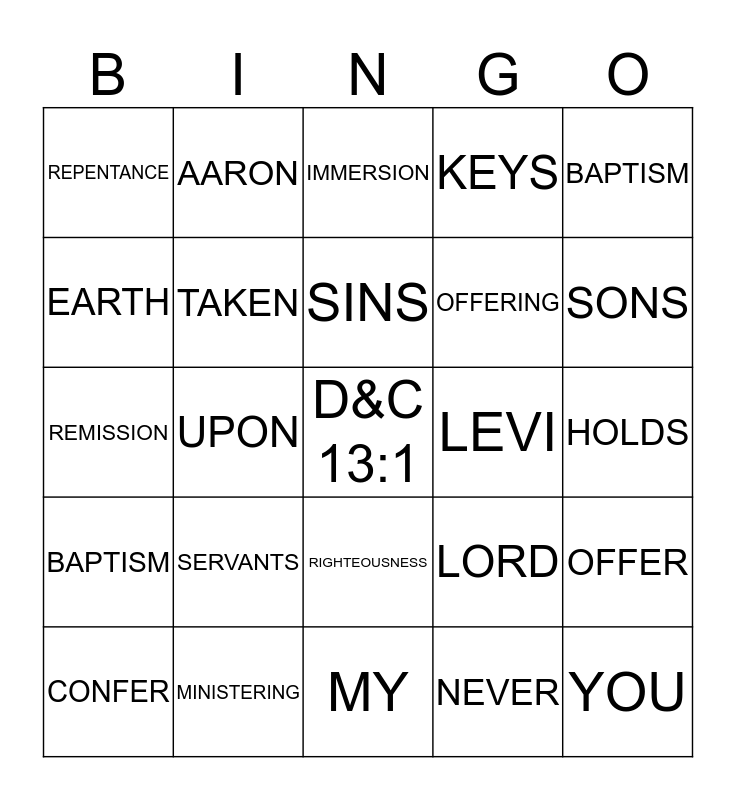 This bingo card has a free space and 24 words: SERVANTS, MINISTERING, SINS, CONFER, BAPTISM, REPENTANCE, EARTH, AARON, LEVI, RIGHTEOUSNESS, OFFERING, REMISSION, LORD, OFFER, TAKEN, NEVER, HOLDS, IMMERSION, SONS, UPON, YOU, BAPTISM, KEYS and MY.