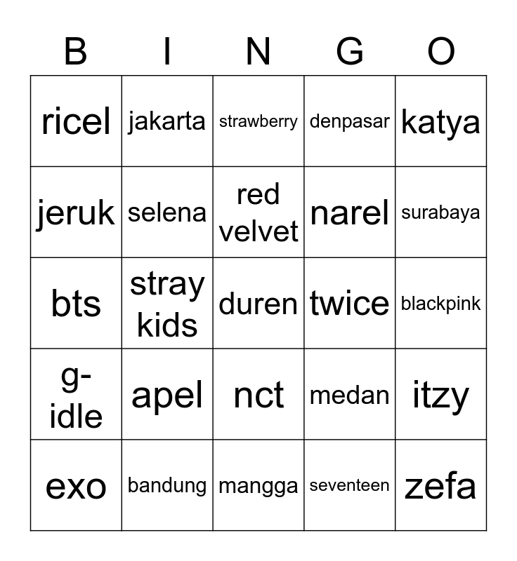 This bingo card has a free space and 24 words: apel, bandung, red velvet, exo, katya, ricel, jeruk, jakarta, twice, nct, narel, bts, medan, itzy, selena, seventeen, blackpink, strawberry, surabaya, stray kids, zefa, g-idle, denpasar and mangga.