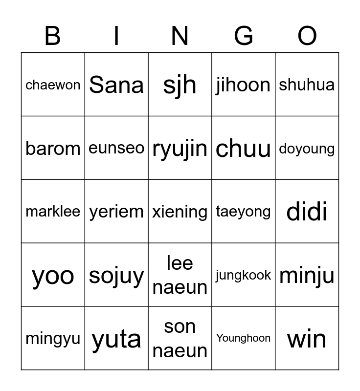 This bingo card has a free space and 24 words: sojuy, yuta, ryujin, mingyu, shuhua, chaewon, barom, Sana, taeyong, lee naeun, chuu, marklee, jungkook, minju, eunseo, Younghoon, didi, sjh, doyoung, yeriem, win, yoo, jihoon and son naeun.