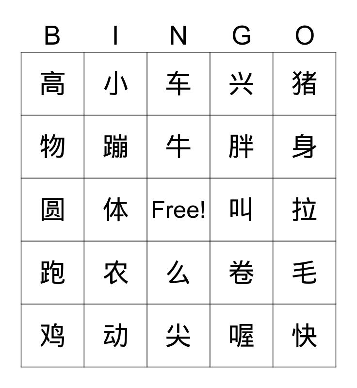 This bingo card has a free space and 24 words: 农, 动, 牛, 鸡, 猪, 高, 物, 小, 叫, 么, 胖, 圆, 卷, 毛, 蹦, 喔, 拉, 车, 身, 体, 快, 跑, 兴 and 尖.