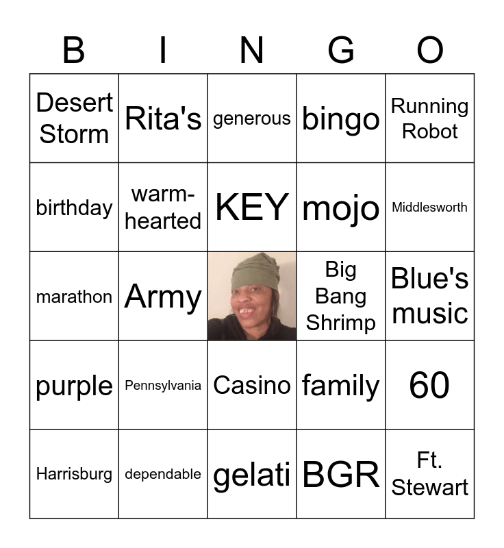 This bingo card has a free space and 24 words: Pennsylvania, dependable, KEY, Harrisburg, Running Robot, Desert Storm, birthday, Rita's, Big Bang Shrimp, Casino, mojo, marathon, family, 60, warm-hearted, BGR, Blue's music, generous, Middlesworth, Army, Ft. Stewart, purple, bingo and gelati.