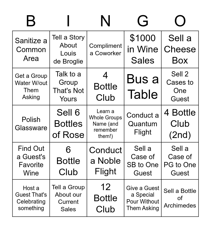 This bingo card has 25 words: 6 Bottle Club, 12 Bottle Club, 4 Bottle Club, Host a Guest That's Celebrating something, Sell a Cheese Box, Sanitize a Common Area, Get a Group Water W/out Them Asking, Tell a Story About Louis de Broglie, Conduct a Quantum Flight, Conduct a Noble Flight, Bus a Table, Polish Glassware, Sell a Case of SB to One Guest, Sell a Case of PG to One Guest, Talk to a Group That's Not Yours, Sell a Bottle of Archimedes, 4 Bottle Club (2nd), Compliment a Coworker, Sell 2 Cases to One Guest, Sell 6 Bottles of Rose, Learn a Whole Groups Name (and remember them!), Tell a Group About our Current Sales, Find Out a Guest's Favorite Wine, $1000 in Wine Sales and Give a Guest a Special Pour Without Them Asking.