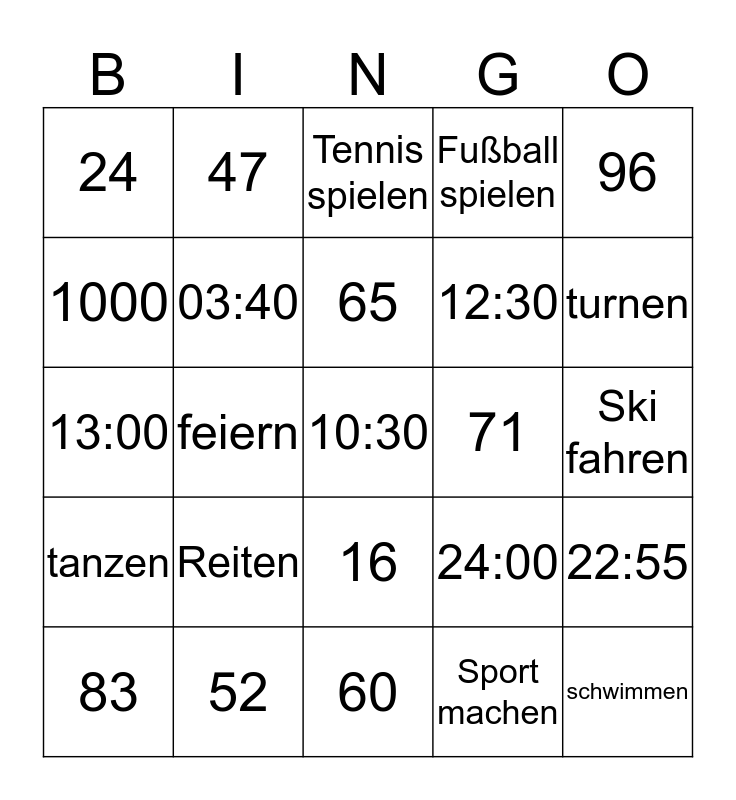 This bingo card has a free space and 24 words: Reiten, 52, 65, 83, 96, 24, 1000, 47, 71, 16, 12:30, 13:00, 24:00, 22:55, 03:40, Sport machen, Ski fahren, Tennis spielen, turnen, feiern, schwimmen, tanzen, Fußball spielen and 60.