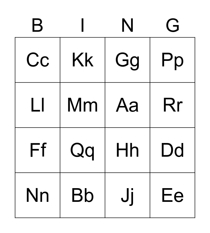 This bingo card has 16 words: Bb, Dd, Gg, Cc, Ff, Kk, Hh, Jj, Ll, Mm, Nn, Pp, Qq, Rr, Aa and Ee.