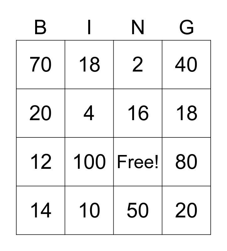 This bingo card has 22 words: 10, 30, 18, 60, 4, 16, 70, 2, Free!, 20, 12, 40, 6, 14, 50, 8, 80, 14, 100, 20, 18 and 90.