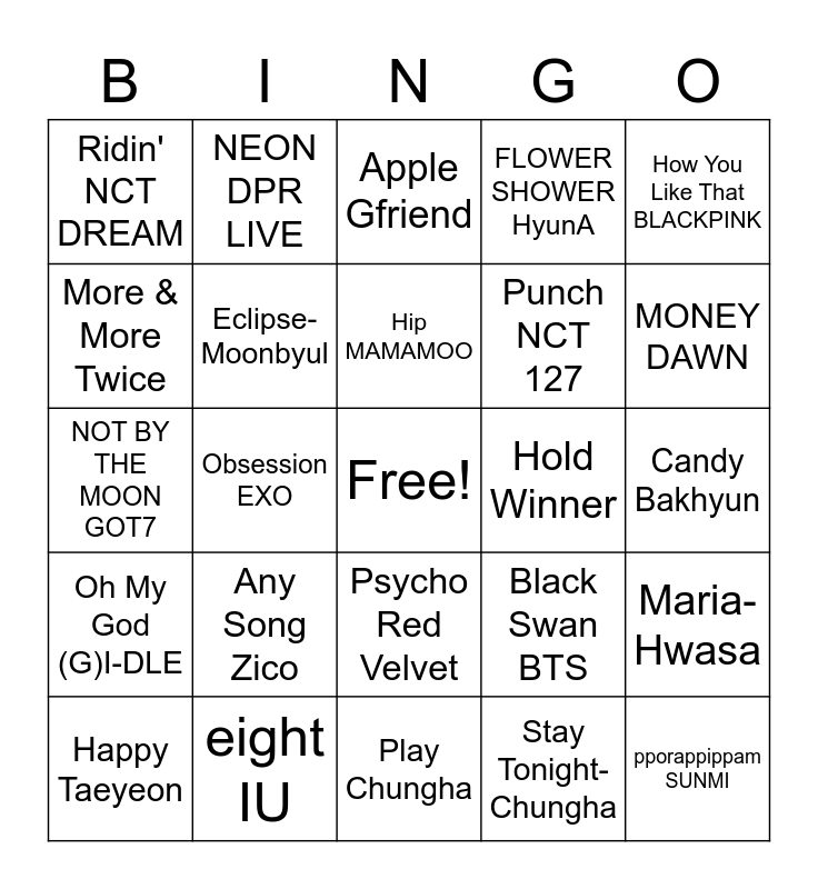 This bingo card has a free space and 24 words: Any Song Zico, eight IU, Hip MAMAMOO, Happy Taeyeon, How You Like That BLACKPINK, Ridin' NCT DREAM, More & More Twice, NEON DPR LIVE, Hold Winner, Psycho Red Velvet, Punch NCT 127, NOT BY THE MOON GOT7, Black Swan BTS, Maria- Hwasa, Eclipse- Moonbyul, Stay Tonight- Chungha, Candy Bakhyun, Apple Gfriend, MONEY DAWN, Obsession EXO, pporappippam SUNMI, Oh My God (G)I-DLE, FLOWER SHOWER HyunA and Play Chungha.