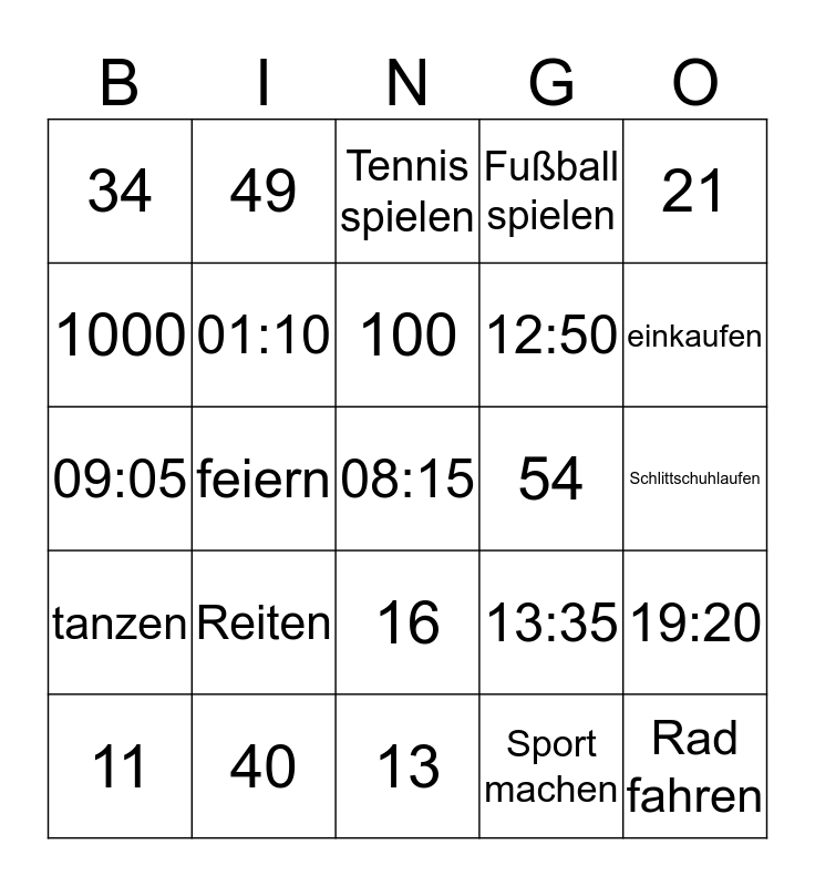 This bingo card has a free space and 24 words: Reiten, 40, 100, 11, 21, 34, 1000, 49, 54, 16, 12:50, 09:05, 13:35, 19:20, 01:10, Sport machen, Schlittschuhlaufen, Tennis spielen, einkaufen, feiern, Rad fahren, tanzen, Fußball spielen and 13.