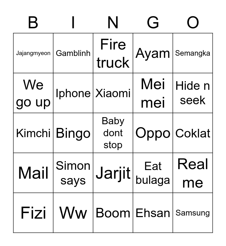 This bingo card has a free space and 24 words: Simon says, Ww, Xiaomi, Fizi, Semangka, Jajangmyeon, We go up, Gamblinh, Oppo, Jarjit, Mei mei, Kimchi, Eat bulaga, Real me, Iphone, Ehsan, Coklat, Fire truck, Hide n seek, Bingo, Samsung, Mail, Ayam and Boom.