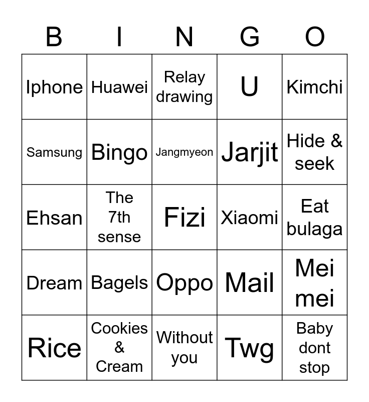 This bingo card has a free space and 24 words: Bagels, Cookies & Cream, Jangmyeon, Rice, Kimchi, Iphone, Samsung, Huawei, Xiaomi, Oppo, Jarjit, Ehsan, Mail, Mei mei, Bingo, Twg, Eat bulaga, Relay drawing, Hide & seek, The 7th sense, Baby dont stop, Dream, U and Without you.
