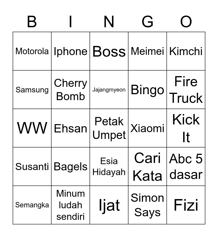 This bingo card has a free space and 24 words: Bagels, Minum ludah sendiri, Jajangmyeon, Semangka, Kimchi, Motorola, Samsung, Iphone, Xiaomi, Esia Hidayah, Bingo, WW, Cari Kata, Abc 5 dasar, Cherry Bomb, Simon Says, Kick It, Boss, Fire Truck, Ehsan, Fizi, Susanti, Meimei and Ijat.