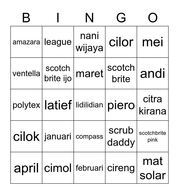 This bingo card has 25 words: januari, februari, maret, april, mei, amazara, ventella, league, piero, compass, scotch brite, polytex, scrub daddy, scotchbrite pink, scotch brite ijo, mat solar, citra kirana, nani wijaya, andi, latief, lidilidian, cimol, cilok, cilor and cireng.