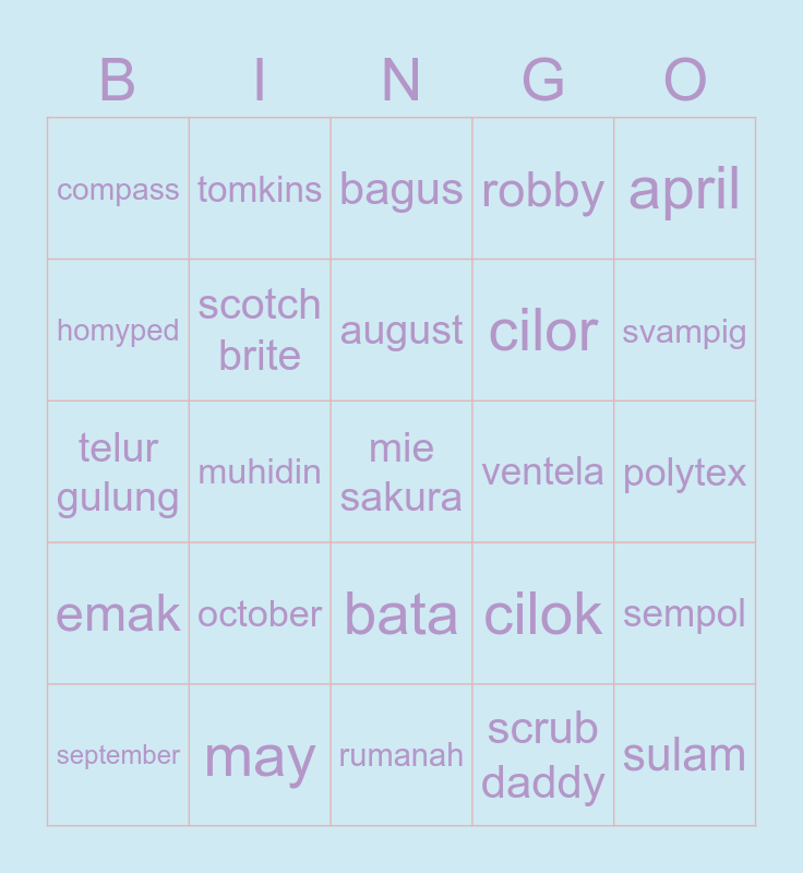 This bingo card has a free space and 24 words: october, may, august, september, april, compass, homyped, tomkins, ventela, bata, cilor, telur gulung, cilok, sempol, scotch brite, scrub daddy, polytex, bagus, svampig, muhidin, sulam, emak, robby and rumanah.