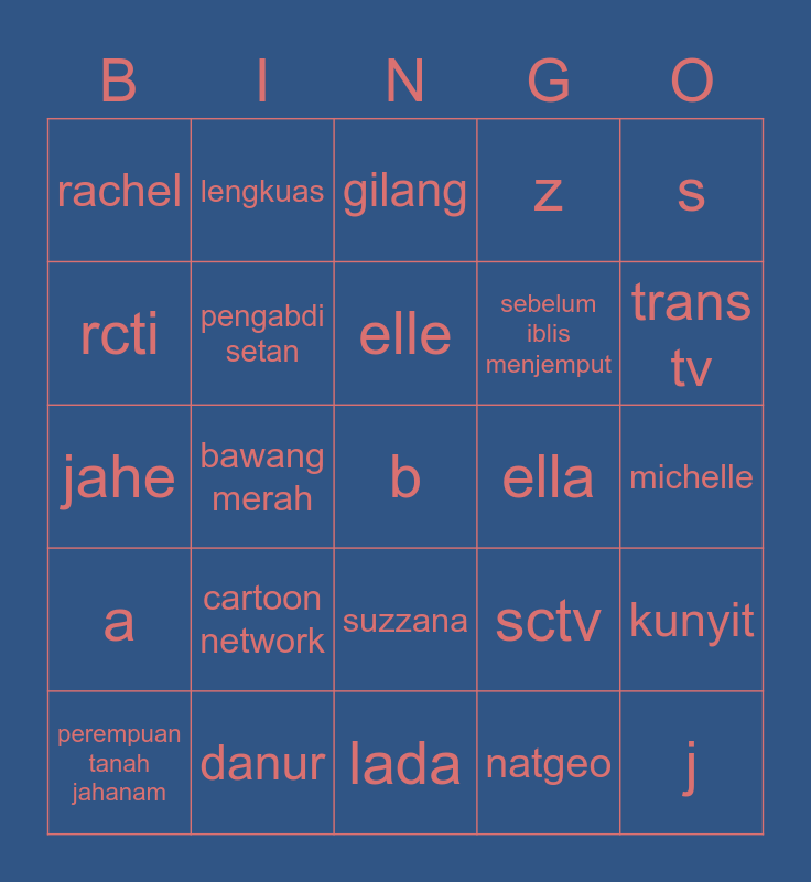 This bingo card has 25 words: cartoon network, lada, elle, perempuan tanah jahanam, s, rachel, rcti, lengkuas, ella, suzzana, sebelum iblis menjemput, jahe, sctv, kunyit, pengabdi setan, j, michelle, gilang, trans tv, bawang merah, b, danur, a, z and natgeo.