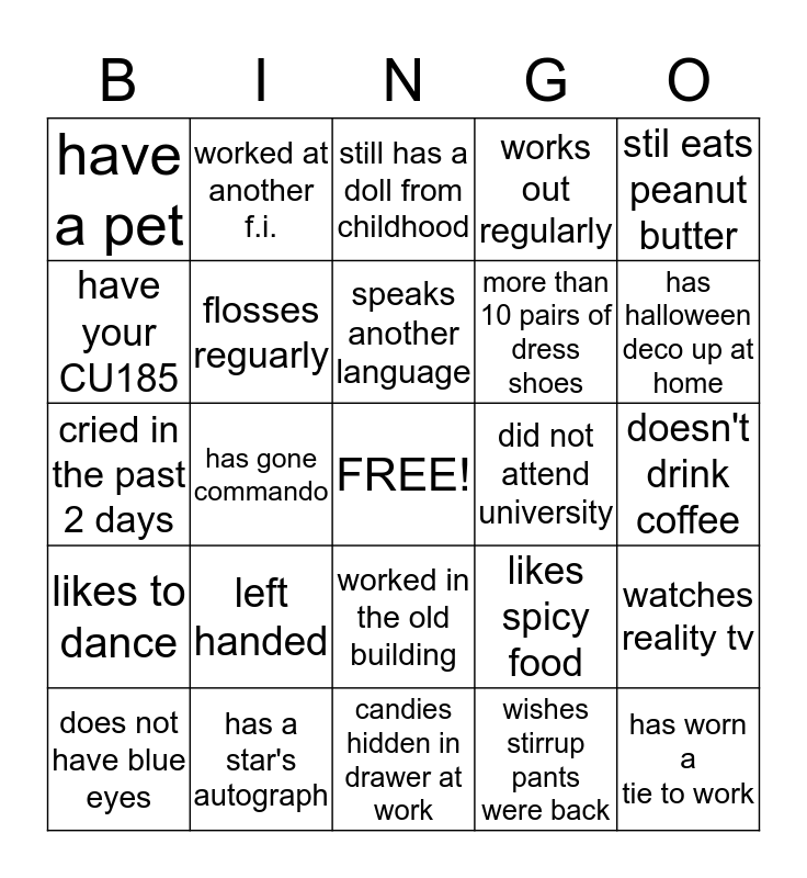 This bingo card has a free space and 24 words: left handed, has a star's autograph, speaks another language, does not have blue eyes, stil eats peanut butter, have a pet, have your CU185, worked at another f.i., did not attend university, worked in the old building, more than 10 pairs of dress shoes, cried in the past 2 days, likes spicy food, watches reality tv, flosses reguarly, wishes stirrup pants were back, doesn't drink coffee, still has a doll from childhood, has halloween deco up at home, has gone commando, has worn a tie to work, likes to dance, works out regularly and candies hidden in drawer at work.