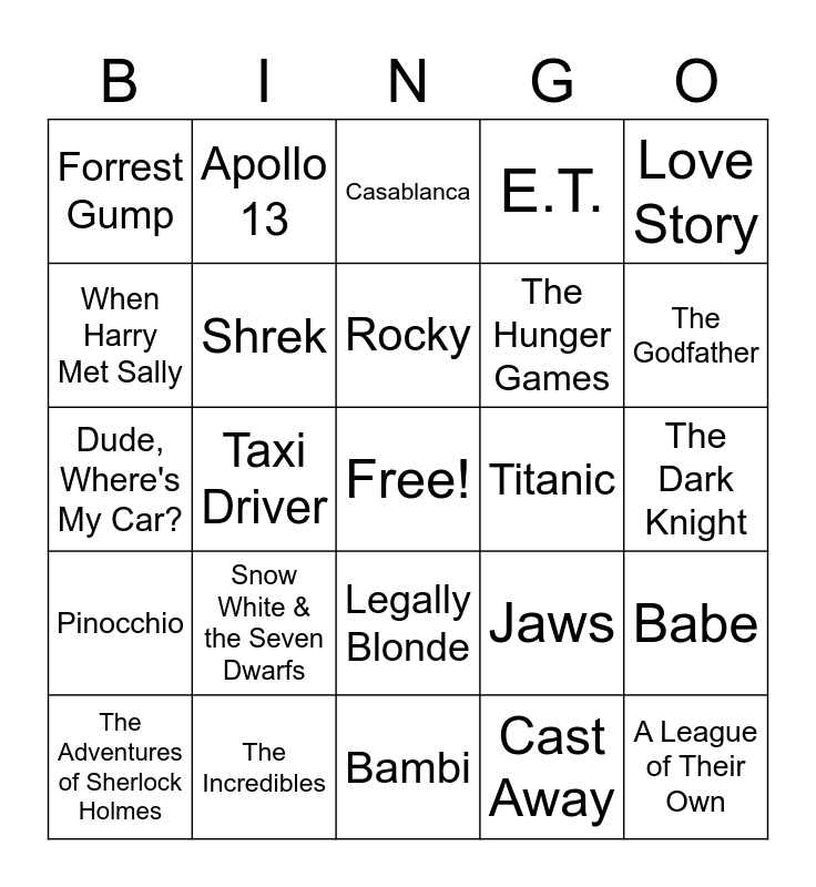 This bingo card has a free space and 42 words: Toy Story, Rocky, Spider-Man, Snow White & the Seven Dwarfs, Cast Away, Babe, A League of Their Own, Finding Nemo, Casablanca, Legally Blonde, The Dark Knight, The Godfather, Taxi Driver, Love Story, Bonnie and Clyde, Jaws, The Sixth Sense, Dude, Where's My Car?, A Star is Born, Apollo 13, When Harry Met Sally, Top Gun, Frozen, Forrest Gump, The Terminator, A Streetcar Named Desire, The Hunger Games, The Wizard of Oz, Jerry Maguire, Cinderella, Field of Dreams, Pinocchio, Shrek, Bambi, Star Wars, The Adventures of Sherlock Holmes, The Incredibles, Titanic, Sudden Impact, Dr. No, E.T. and Dirty Dancing.