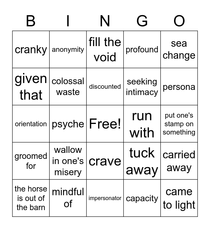 This bingo card has a free space and 40 words: attributes, orientation, whereas, colossal waste, mindful of, crave, discounted, on the verge of, sea change, groomed for, psyche, profound, came to light, put one's stamp on something, run with, wallow in one's misery, diagnosis, cranky, make lemonade out of lemons, fill the void, carried away, capacity, seeking intimacy, given that, collaborate with, overwhelmed, throttle back, conscious choice, velocity, get a grip, degradation, the horse is out of the barn, ratcheted down, tuck away, persona, impersonator, advocate, pseudonymity, anonymity and debacle.