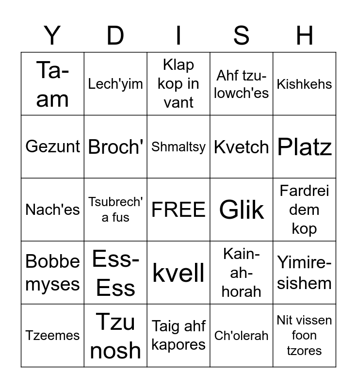 This bingo card has a free space and 24 words: Ess-Ess, Tzu nosh, Shmaltsy, Tzeemes, Kishkehs, Ta-am, Gezunt, Lech'yim, Glik, kvell, Kvetch, Nach'es, Kain-ah-horah, Yimire-sishem, Broch', Ch'olerah, Fardrei dem kop, Klap kop in vant, Platz, Tsubrech' a fus, Nit vissen foon tzores, Bobbe myses, Ahf tzu-lowch'es and Taig ahf kapores.