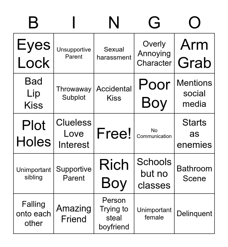 This bingo card has a free space and 24 words: Supportive Parent, Amazing Friend, Accidental Kiss, Falling onto each other, Arm Grab, Eyes Lock, Bad Lip Kiss, Unsupportive Parent, No Communication, Rich Boy, Poor Boy, Plot Holes, Schools but no classes, Bathroom Scene, Throwaway Subplot, Unimportant female, Starts as enemies, Sexual harassment, Mentions social media, Clueless Love Interest, Delinquent, Unimportant sibling, Overly Annoying Character and Person Trying to steal boyfriend.