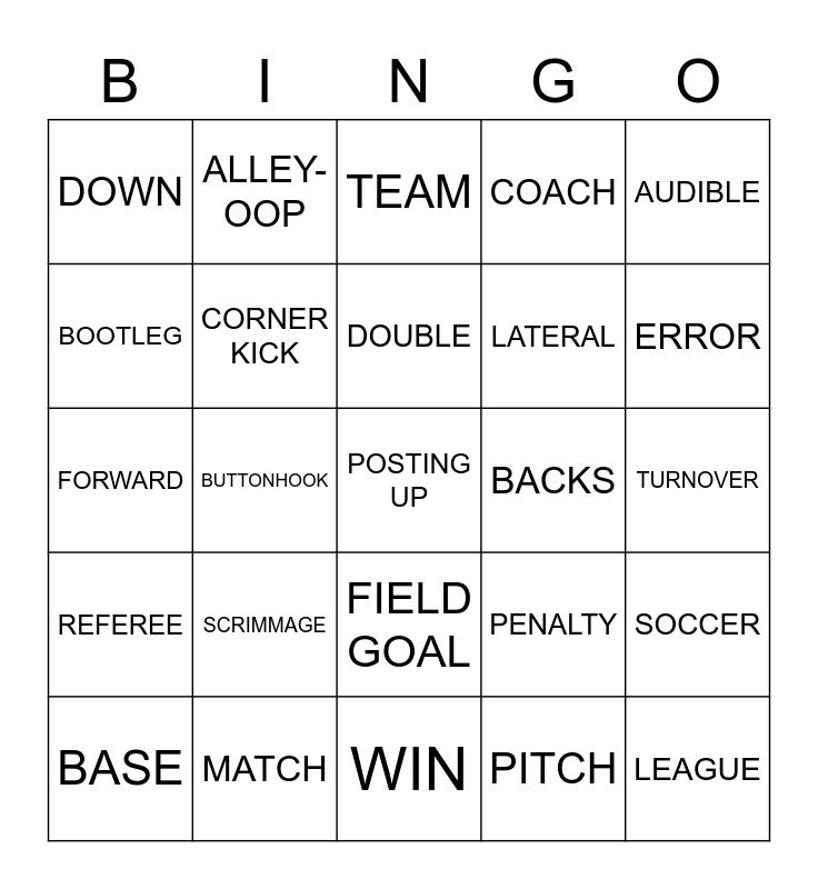 This bingo card has a free space and 64 words: Free!, BASKETBALL, BASEBALL, SOCCER, HOCKEY, FOOTBALL, ALLEY-OOP, CHERRY PICKING, DOUBLE, FAST BREAK, FIELD GOAL, KEY, TURNOVER, AUDIBLE, BLITZ, BOOTLEG, BUTTONHOOK, DOWN, HAIL MARY, LATERAL, SCRIMMAGE, REFEREE, COACH, PLAYER, BODY CHECK, FACE-OFF, GOAL, POWER PLAY, ROUGHING, E.R.A., BAT, R.B.I., OUT, FOUL, ERROR, BASE, OUTFIELD, PITCH, CATCH, CORNER KICK, FORWARD, BACKS, DEFENDER, GOALIE, DRIBBLING, LEAGUE, MATCH, OFFSIDE, PENALTY, SIDELINE, FAN, TACKLE, WIN, CHAMPION, STRENGTH, ENDURANCE, TEAM, PATS, 2019 CHAMPS, TOM BRADY, BILL B., TROPHY, ANOTHER RING and GRONK.