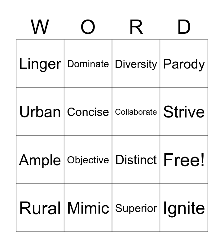 This bingo card has 16 words: Mimic, Free!, Diversity, Linger, Ample, Dominate, Distinct, Superior, Urban, Concise, Rural, Parody, Objective, Strive, Collaborate and Ignite.