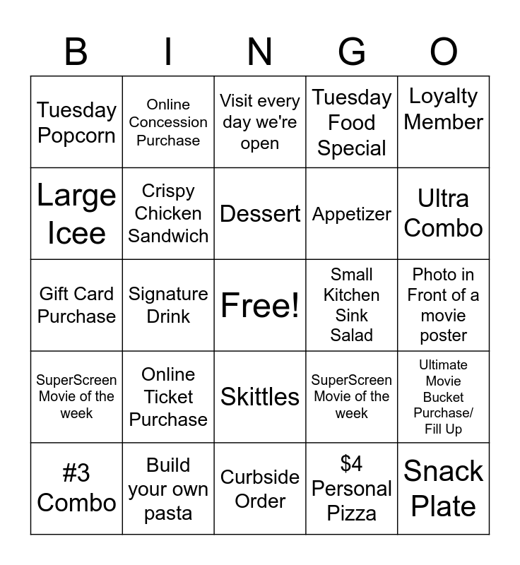 This bingo card has a free space and 24 words: Online Ticket Purchase, Build your own pasta, Dessert, #3 Combo, Loyalty Member, Tuesday Popcorn, Large Icee, Online Concession Purchase, Small Kitchen Sink Salad, Skittles, Appetizer, Gift Card Purchase, SuperScreen Movie of the week, Ultimate Movie Bucket Purchase/ Fill Up, Crispy Chicken Sandwich, $4 Personal Pizza, Photo in Front of a movie poster, Visit every day we're open, Ultra Combo, Signature Drink, Snack Plate, SuperScreen Movie of the week, Tuesday Food Special and Curbside Order.