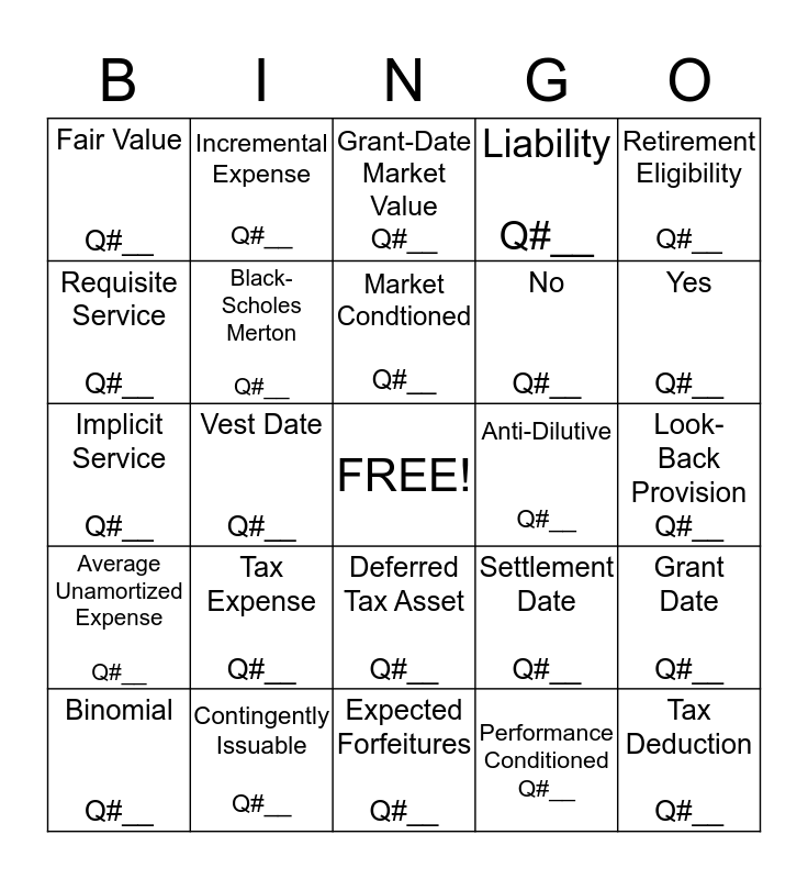 This bingo card has a free space and 24 words: Tax Expense Q#__, Contingently Issuable Q#__, Market Condtioned Q#__, Binomial Q#__, Retirement Eligibility Q#__, Fair Value Q#__, Requisite Service Q#__, Incremental Expense Q#__, Anti-Dilutive Q#__, Deferred Tax Asset Q#__, No Q#__, Implicit Service Q#__, Settlement Date Q#__, Grant Date Q#__, Black-Scholes Merton Q#__, Performance Conditioned Q#__, Look-Back Provision Q#__, Grant-Date Market Value Q#__, Yes Q#__, Vest Date Q#__, Tax Deduction Q#__, Average Unamortized Expense Q#__, Liability Q#__ and Expected Forfeitures Q#__.