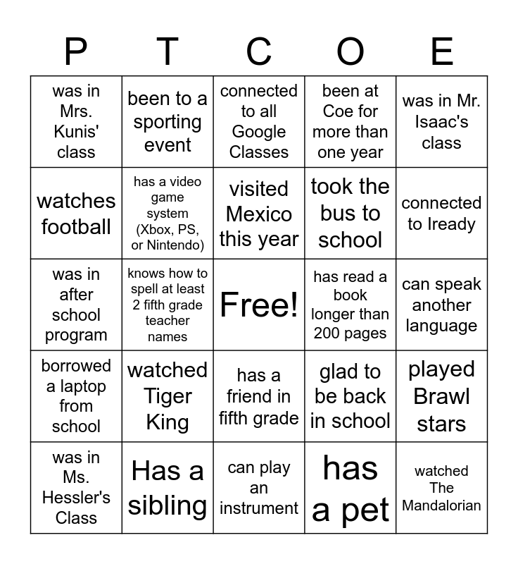 This bingo card has a free space and 24 words: watched Tiger King, Has a sibling, visited Mexico this year, was in Ms. Hessler's Class, was in Mr. Isaac's class, was in Mrs. Kunis' class, watches football, been to a sporting event, has read a book longer than 200 pages, has a friend in fifth grade, took the bus to school, was in after school program, glad to be back in school, played Brawl stars, has a video game system (Xbox, PS, or Nintendo), has a pet, can speak another language, connected to all Google Classes, connected to Iready, knows how to spell at least 2 fifth grade teacher names, watched The Mandalorian, borrowed a laptop from school, been at Coe for more than one year and can play an instrument.