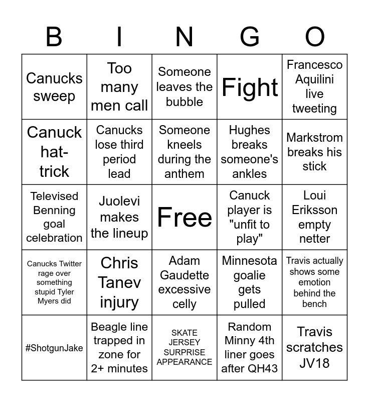 This bingo card has a free space and 24 words: Chris Tanev injury, Beagle line trapped in zone for 2+ minutes, Someone kneels during the anthem, #ShotgunJake, Francesco Aquilini live tweeting, Canucks sweep, Canuck hat-trick, Too many men call, Canuck player is "unfit to play", Adam Gaudette excessive celly, Hughes breaks someone's ankles, Televised Benning goal celebration, Minnesota goalie gets pulled, Travis actually shows some emotion behind the bench, Canucks lose third period lead, Random Minny 4th liner goes after QH43, Loui Eriksson empty netter, Someone leaves the bubble, Markstrom breaks his stick, Juolevi makes the lineup, Travis scratches JV18, Canucks Twitter rage over something stupid Tyler Myers did, Fight and SKATE JERSEY SURPRISE APPEARANCE.