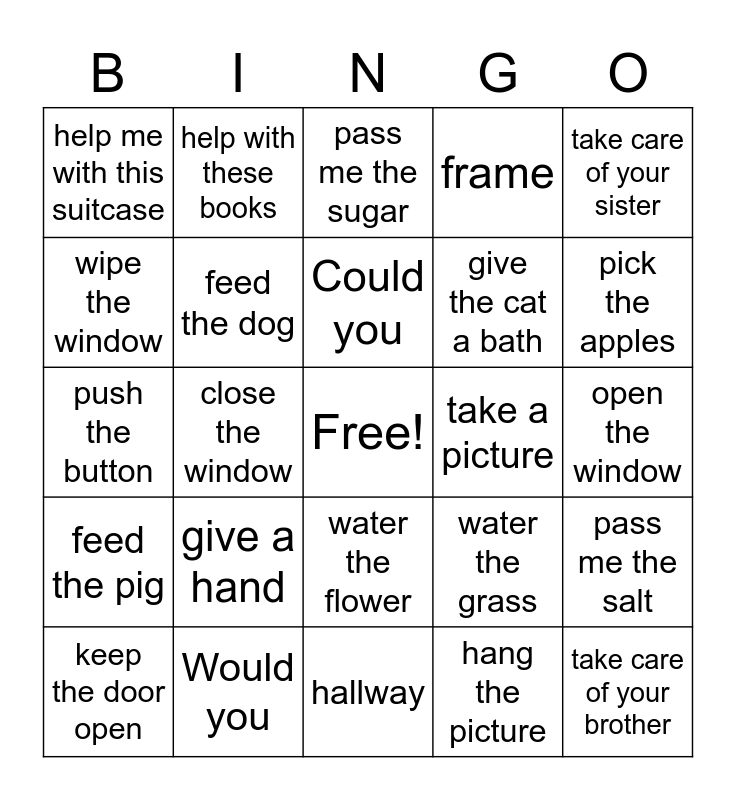 This bingo card has a free space and 24 words: give a hand, Would you, Could you, keep the door open, take care of your sister, help me with this suitcase, wipe the window, help with these books, take a picture, water the flower, give the cat a bath, push the button, water the grass, pass me the salt, feed the dog, hang the picture, open the window, pass me the sugar, pick the apples, close the window, take care of your brother, feed the pig, frame and hallway.