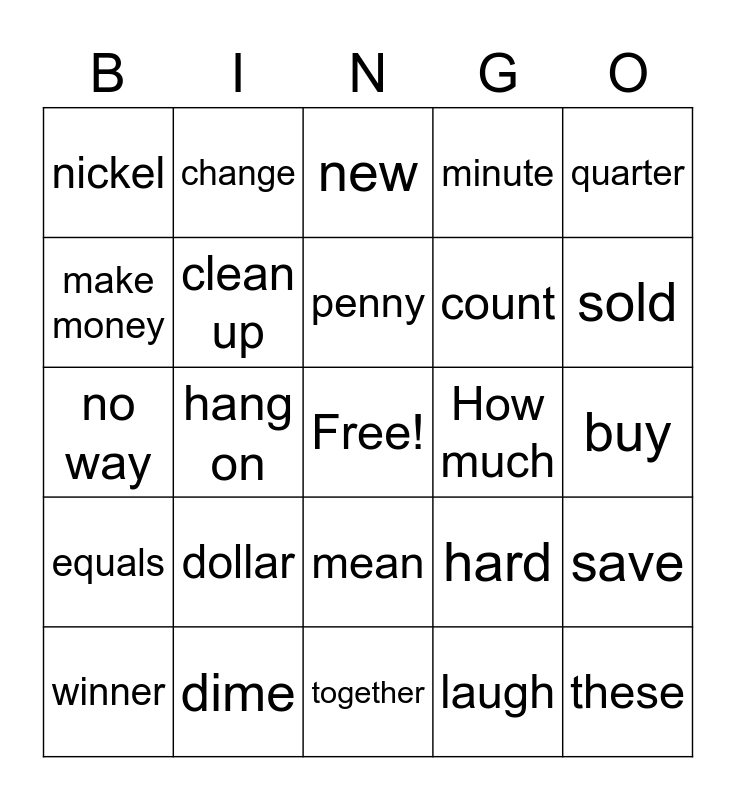 This bingo card has a free space and 24 words: dollar, dime, penny, winner, quarter, nickel, make money, change, How much, mean, count, no way, hard, save, clean up, laugh, buy, new, sold, hang on, these, equals, minute and together.