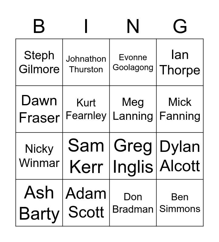 This bingo card has 22 words: Daniel Ricciardo, Adam Scott, Meg Lanning, Ben Simmons, Dawn Fraser, Johnathon Thurston, Evonne Goolagong, Ian Thorpe, Nicky Winmar, Kurt Fearnley, Don Bradman, Mick Fanning, Nick Kyrgios, Sam Kerr, Cathy Freeman, Adam Goodes, Ash Barty, Steve Smith, Dylan Alcott, Steph Gilmore, Greg Inglis and Anthony Mundine.